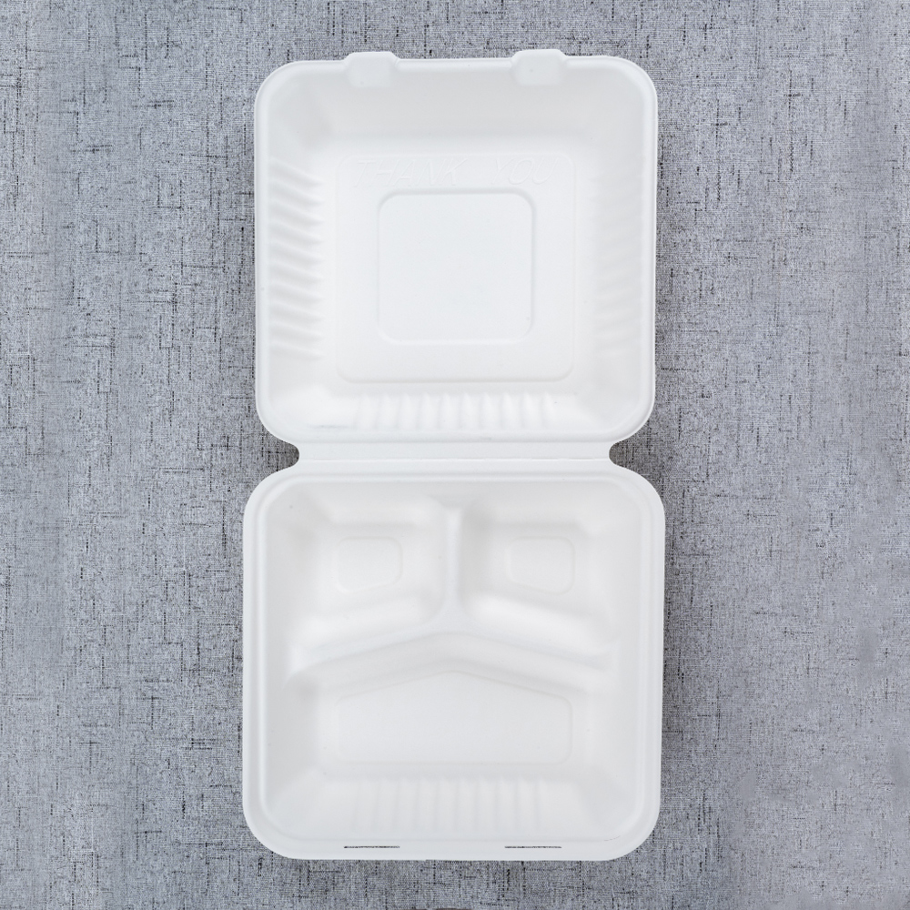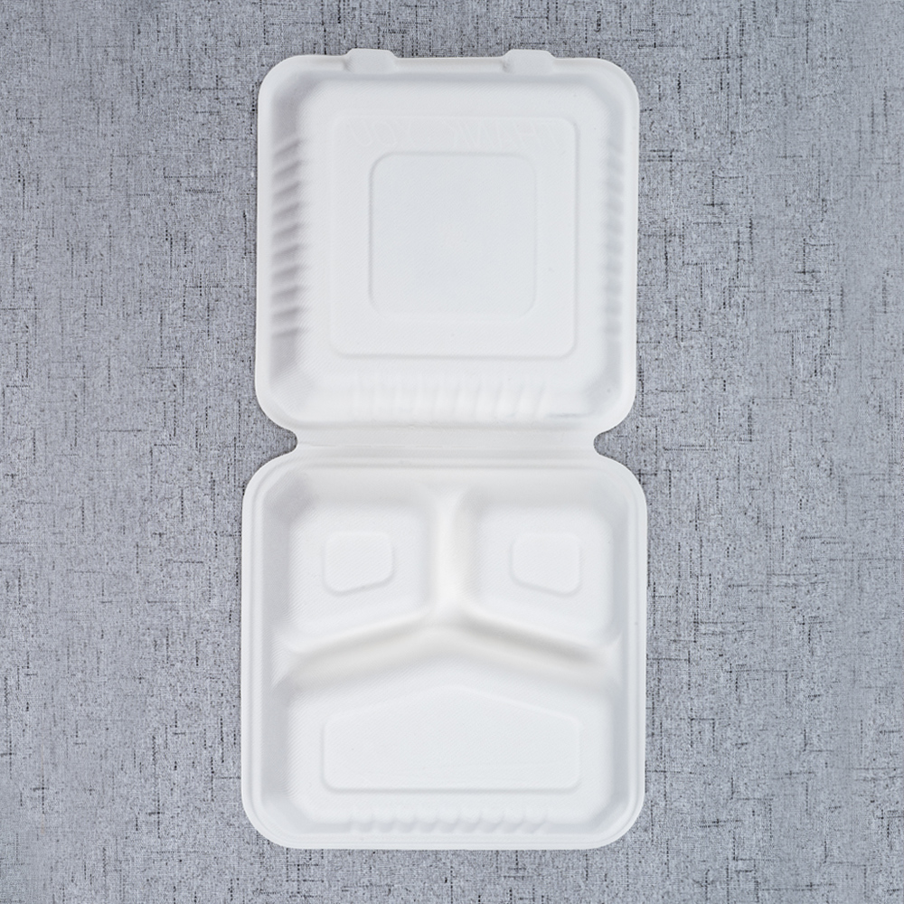 Molded from 100% bagasse fiber, this family-size clamshell replaces plastic/foam for balanced meals and combos. A robust hinge and snap-tight tabs support delivery, while three compartments keep mains and sides neatly separated to preserve texture and prevent flavor transfer. Natural oil/water resistance handles sauced or greasy foods. Microwave-reheat and freezer safe, it’s the go-to eco container for QSRs, canteens, schools, and catering.