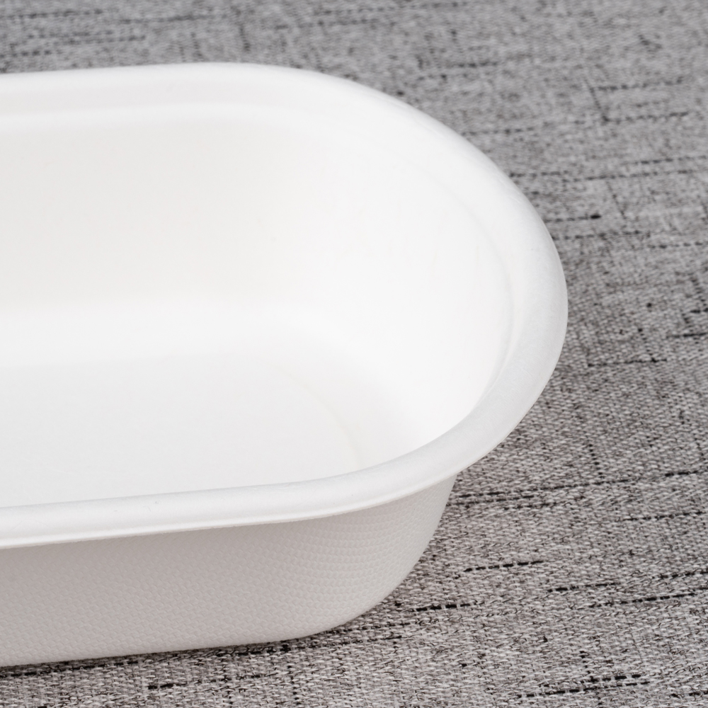 The 800ml Bagasse Oval Lunch Box is made from 100% natural sugarcane fiber. It is biodegradable, compostable, and an eco-friendly replacement for plastic containers.