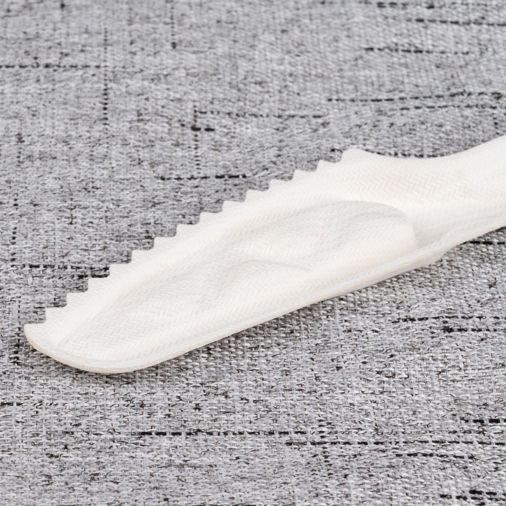 Molded from 100% bagasse fiber, this knife combines plant-based sustainability with a premium white appearance. A smooth, splinter-free handle pairs with a fine micro-serrated edge to cut breads, sandwiches, pastries, soft proteins (chicken, fish), firm cheeses, and roasted vegetables. Taste-neutral and safe for hot or cold meals, it’s an elegant, reliable choice for cafés, restaurants, hotels, catering, and delivery programs that prefer a clean white table setting.