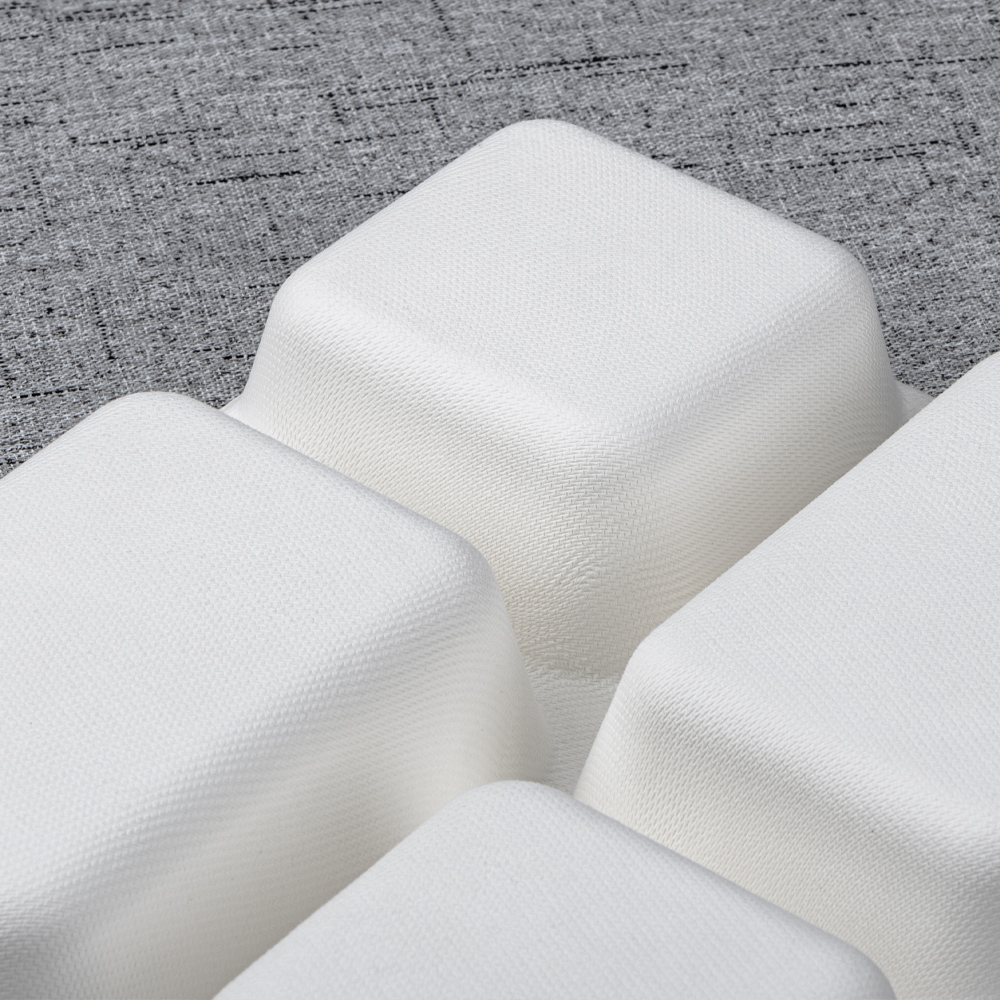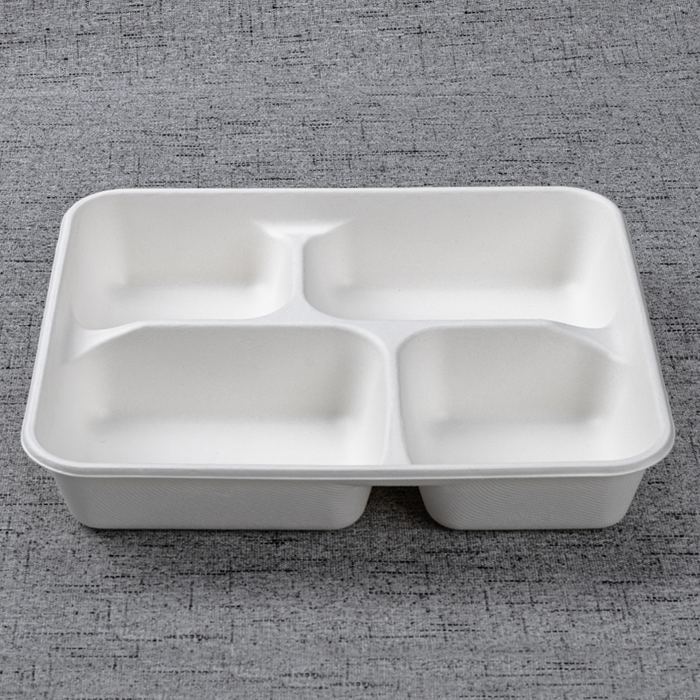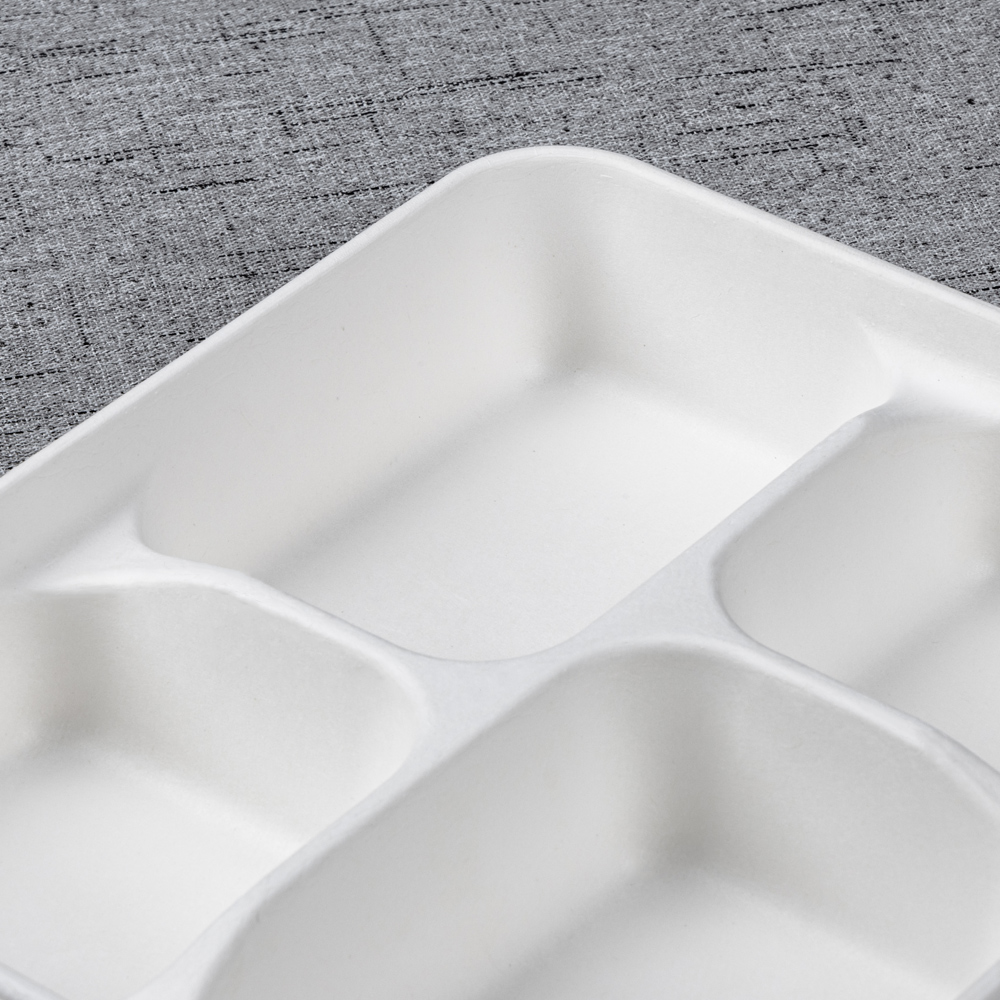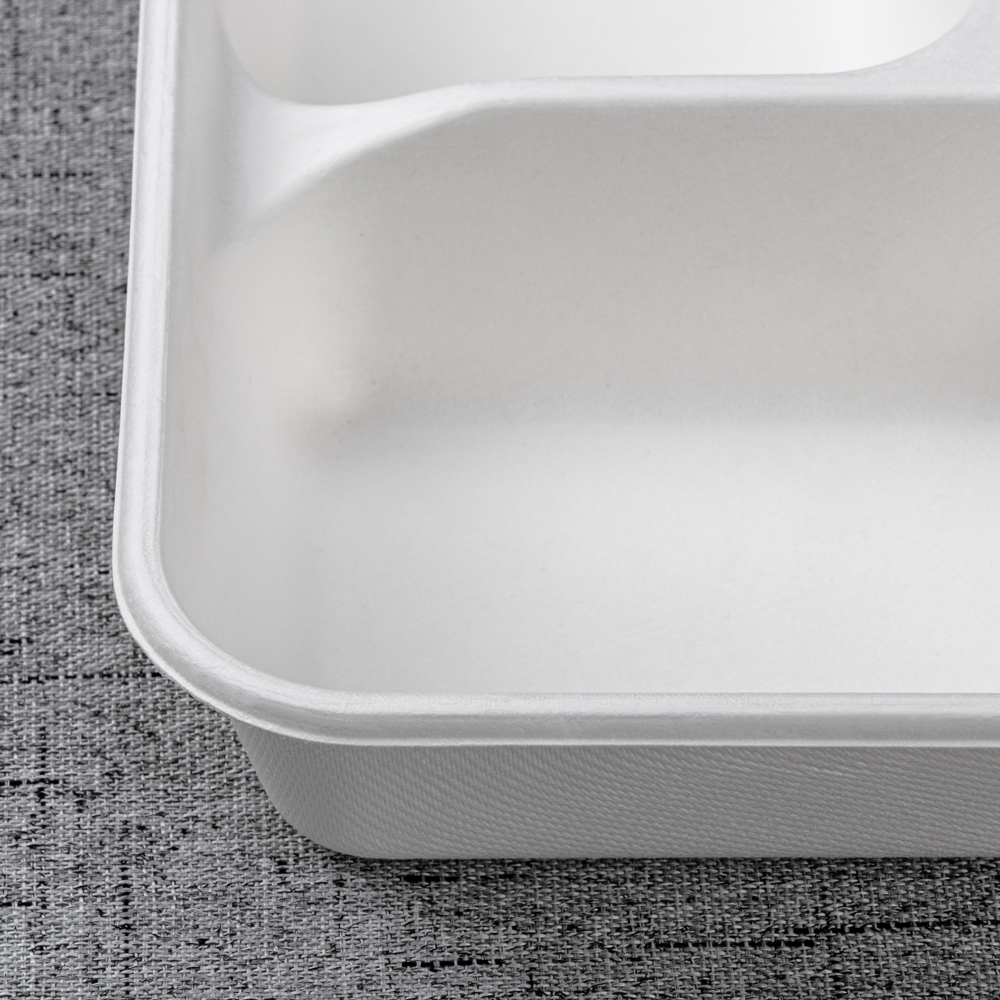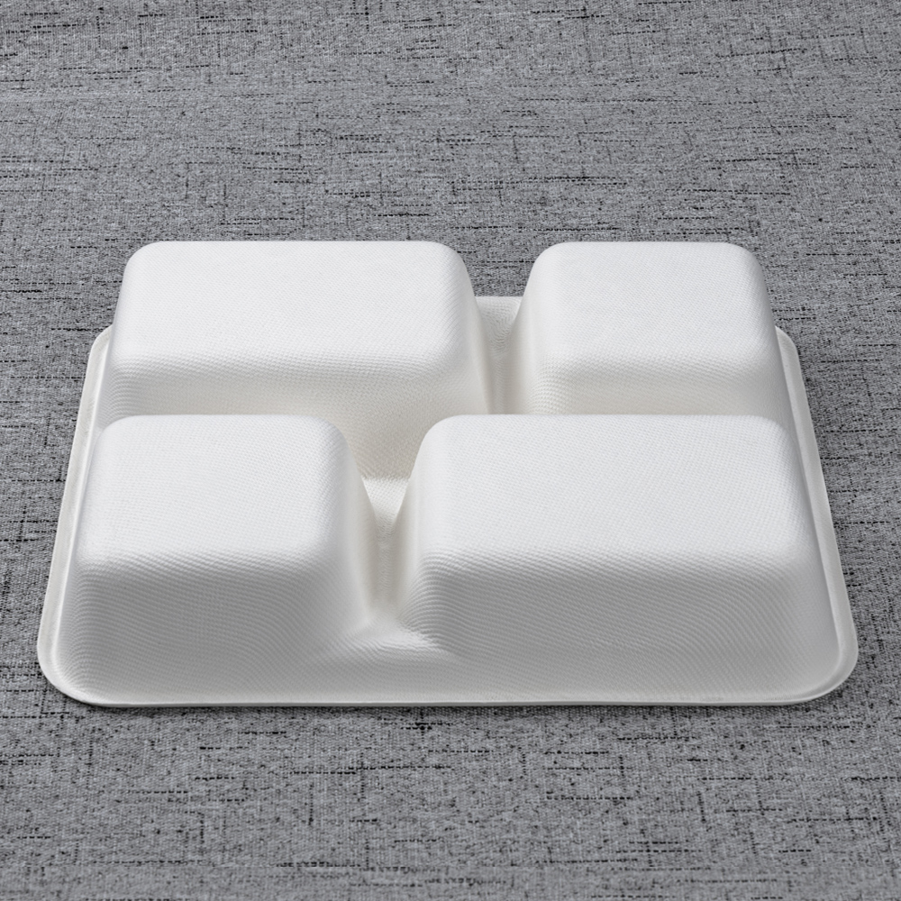Molded from 100% bagasse fiber, this 261 × 222 mm tray keeps an entrée and three sides neatly separated for clean presentation and nutrition programs. The deeper 45 mm wells add capacity and reduce slosh in transit, while a reinforced rim improves handling on buffet rails and pass counters. Microwave-reheat and freezer safe, it’s an efficient, eco-forward choice for canteens, catering, retail chillers, and delivery.