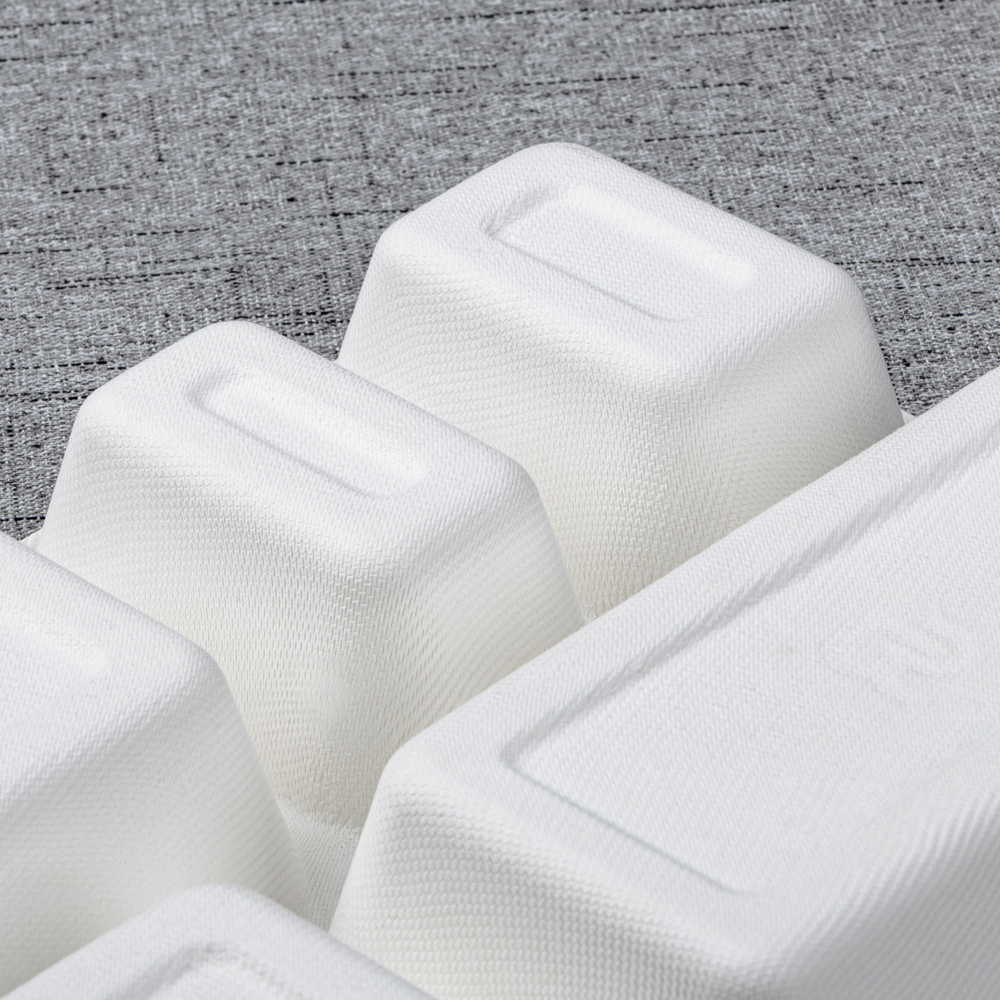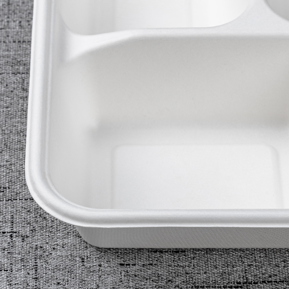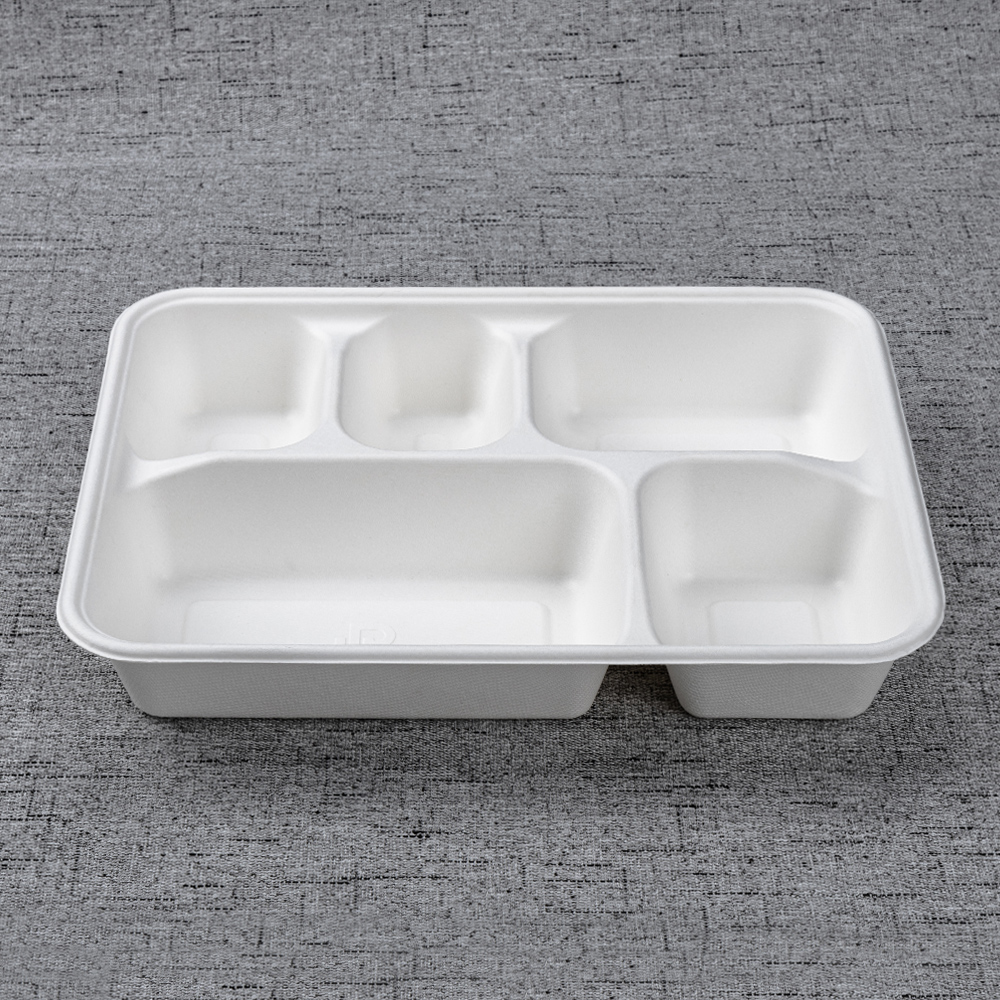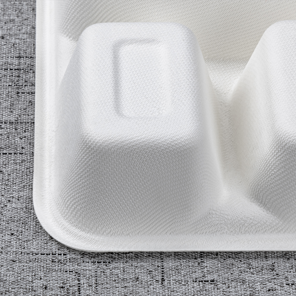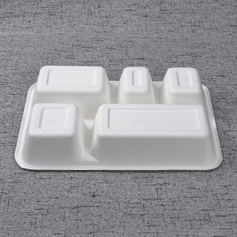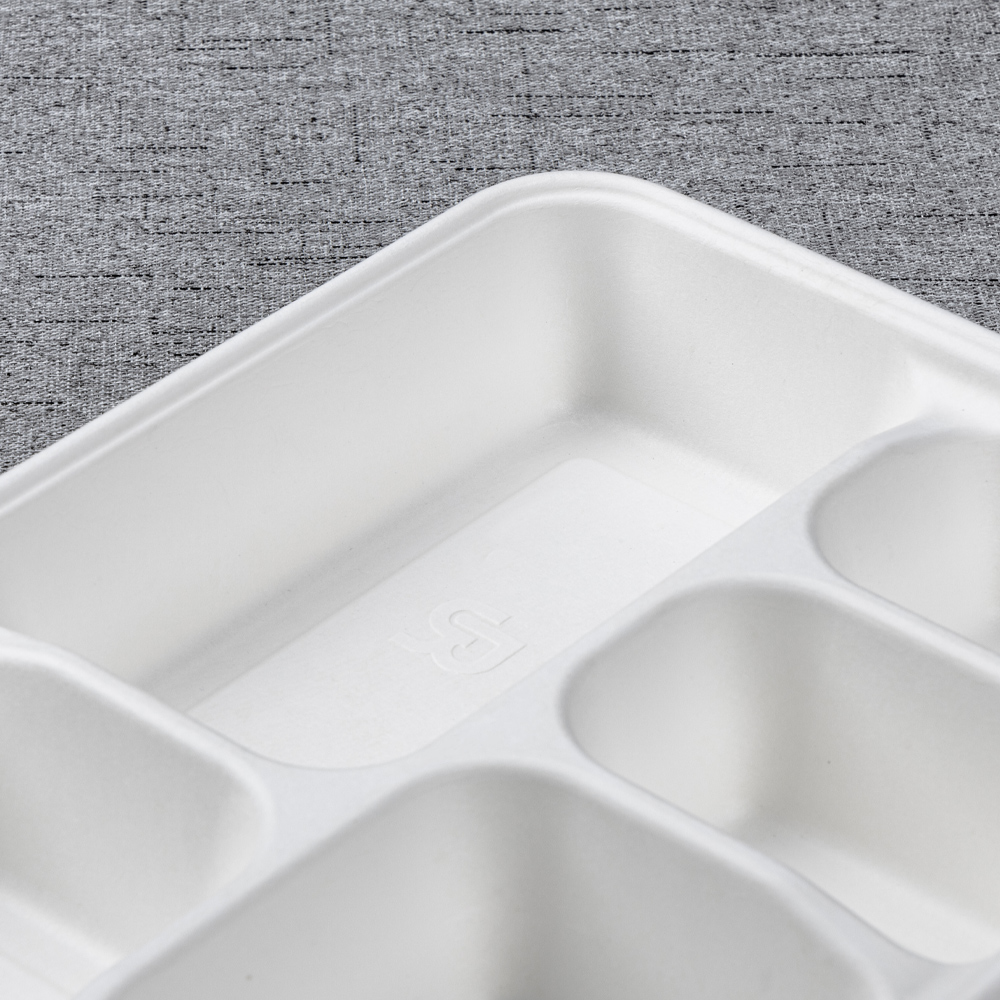 Molded from 100% bagasse fiber, this 273 × 210 mm tray separates a main with four sides for clean presentation and nutrition management. The deeper 44 mm wells add capacity and reduce slosh in transit, while the reinforced rim improves handling on buffet rails and pass counters. Microwave-reheat and freezer safe, it’s an efficient, eco-forward choice for canteens, catering, supermarkets, and delivery.